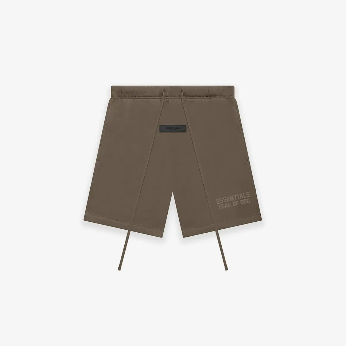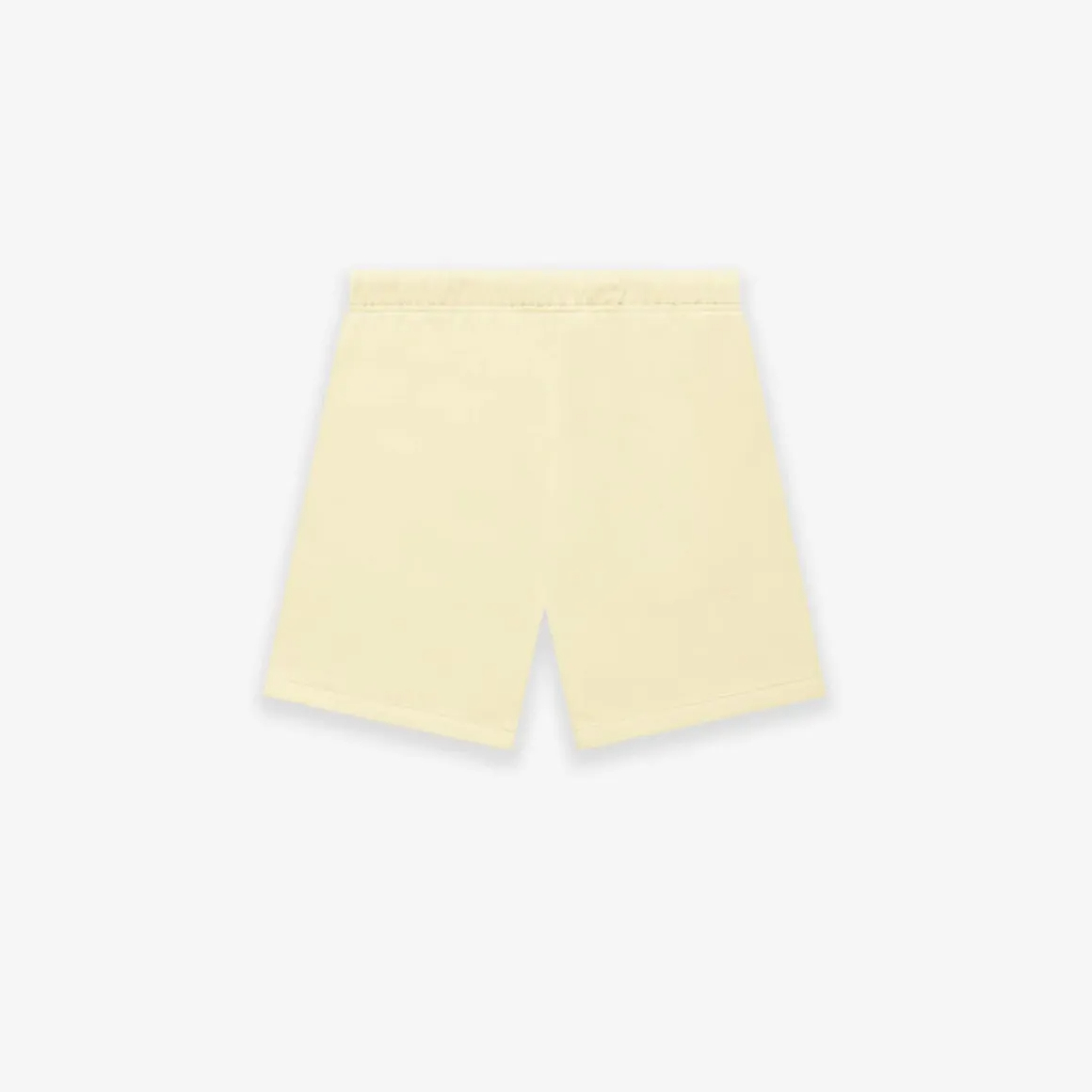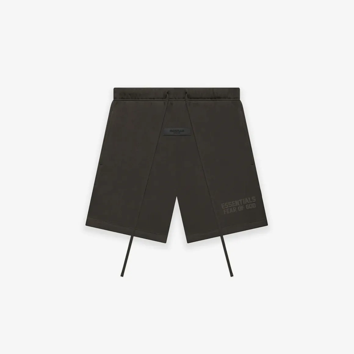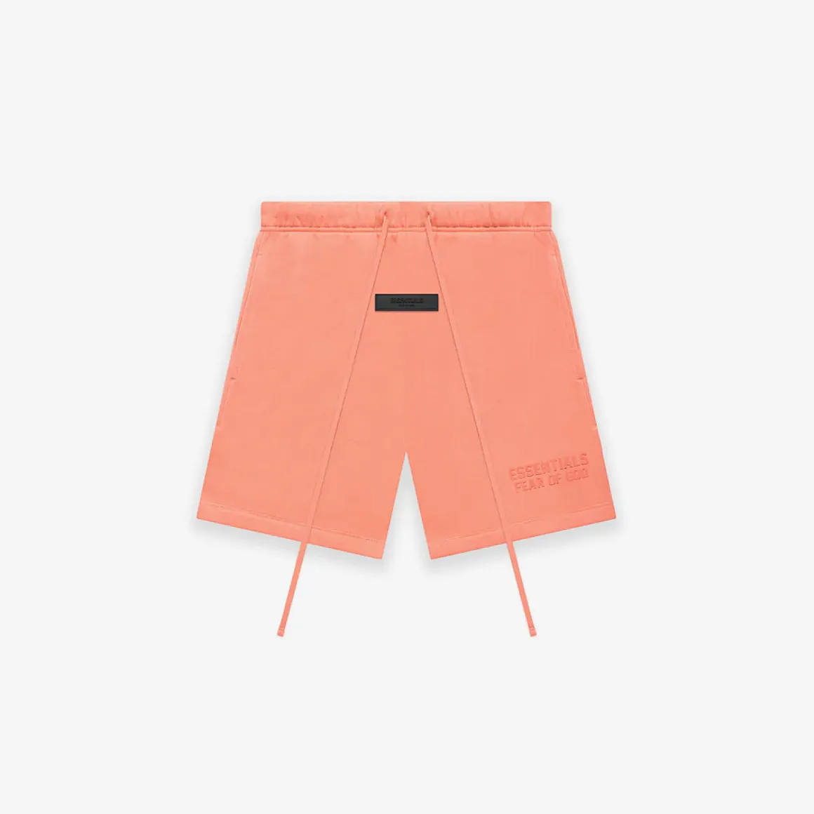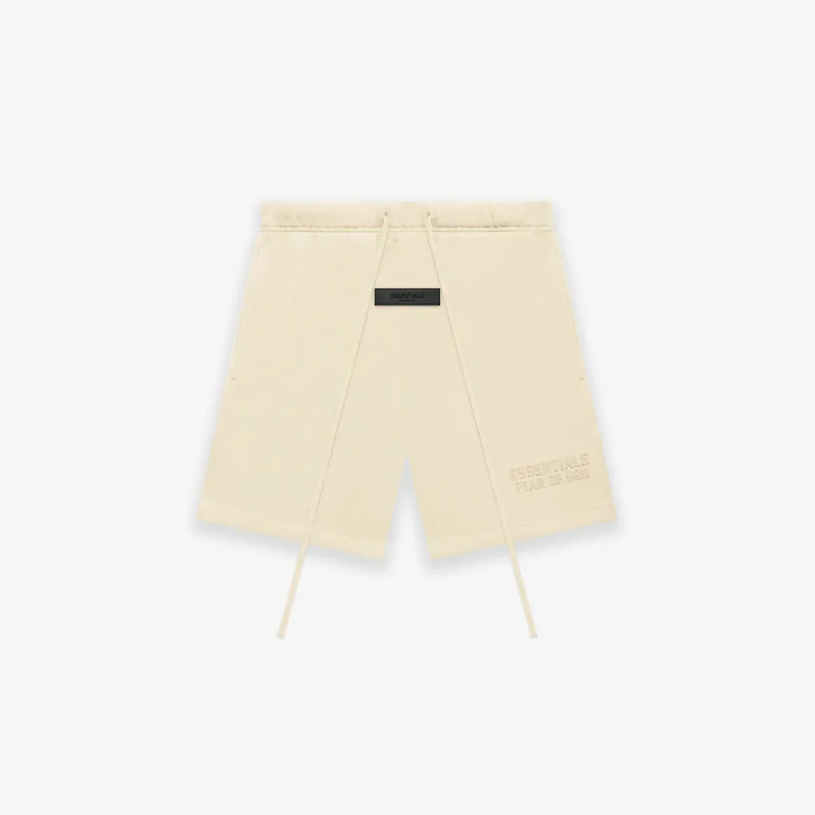 Direct Factory Stock. The signature fleece sweatshort is detailed with an Essentials Fear of God logo in a tonal velvet flocking reminiscent of vintage athletic uniforms. An Essentials rubberized label is center front.