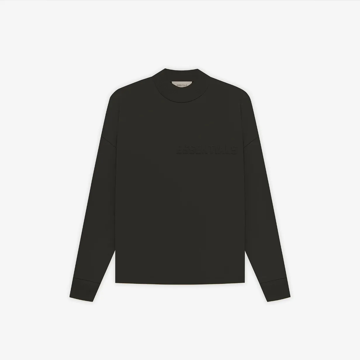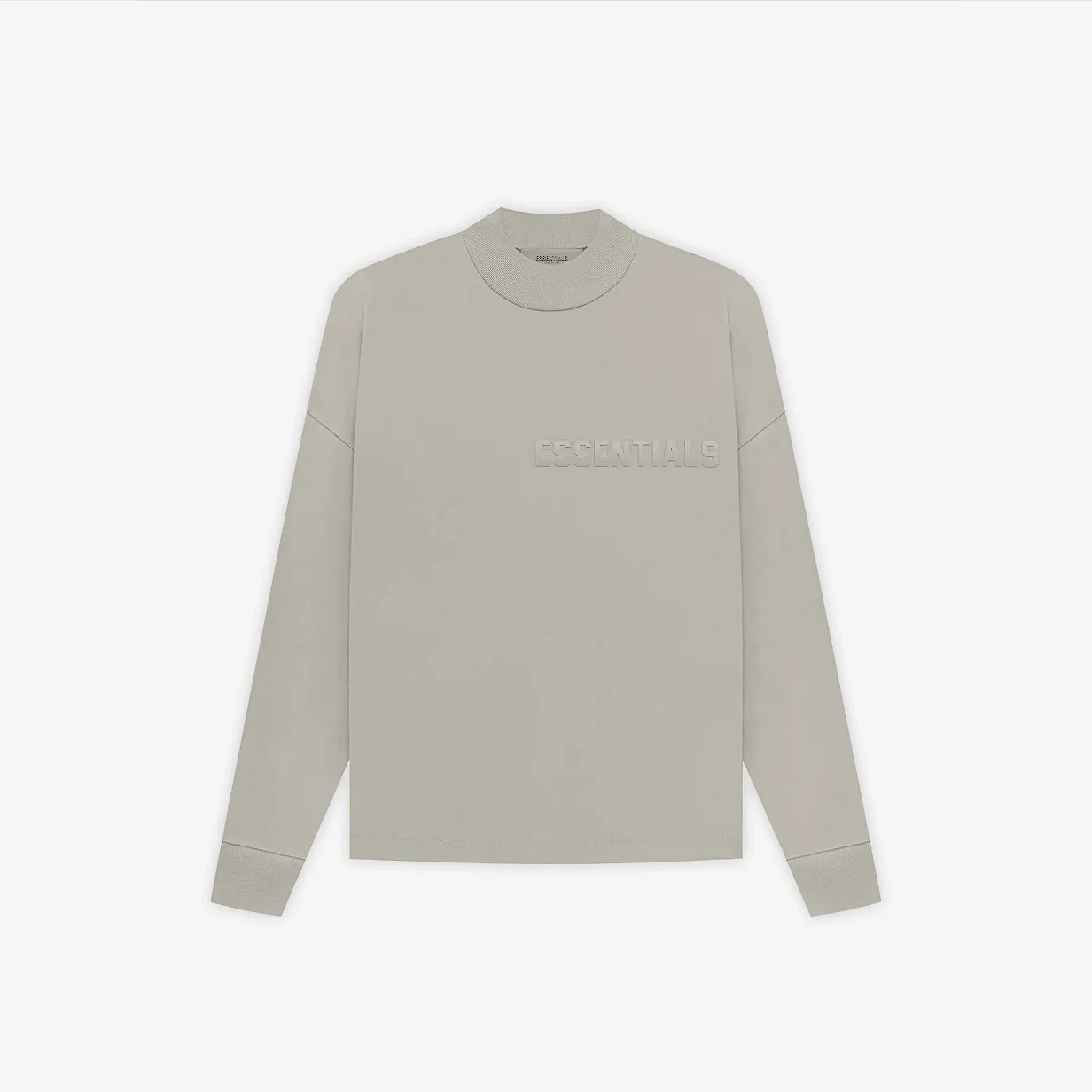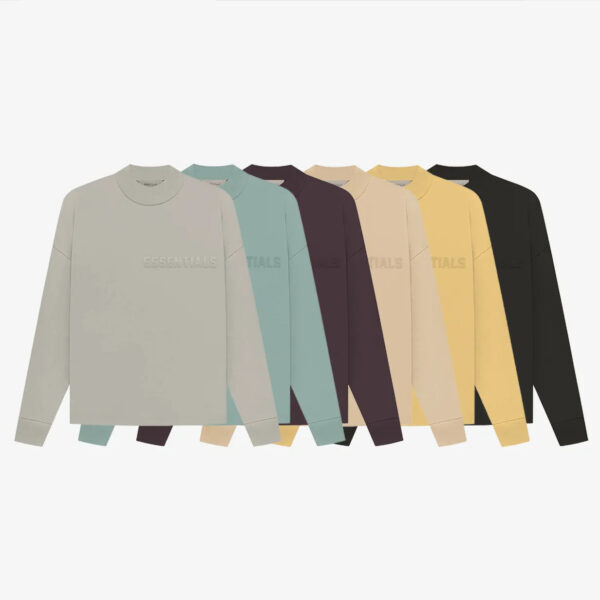 Direct Factory Stock. The signature long-sleeve jersey tee shirt is detailed with a modern Essentials rubberized logo on the chest. An Essentials rubberized label is stitched at the back collar.